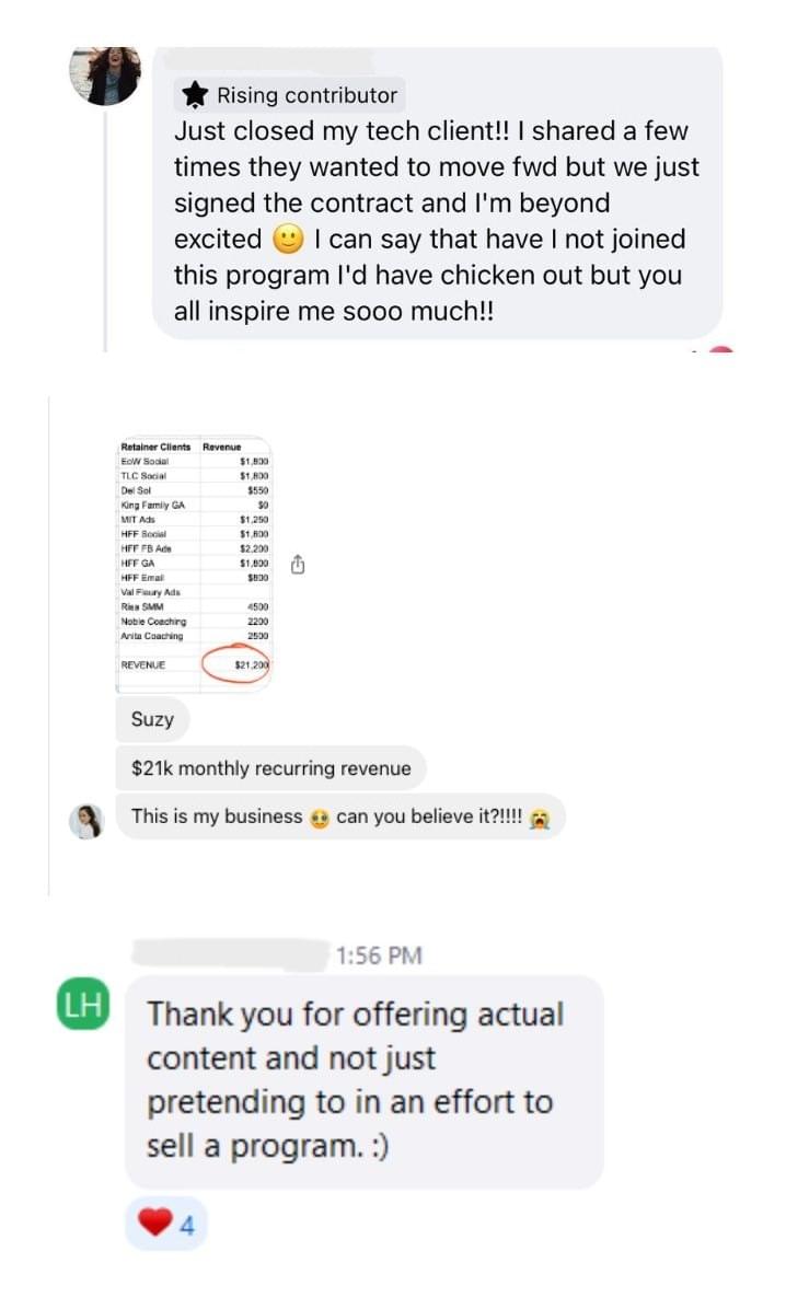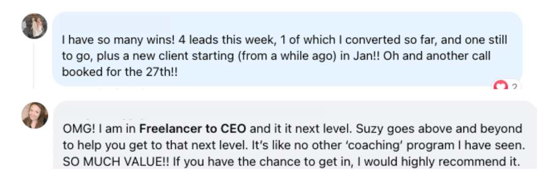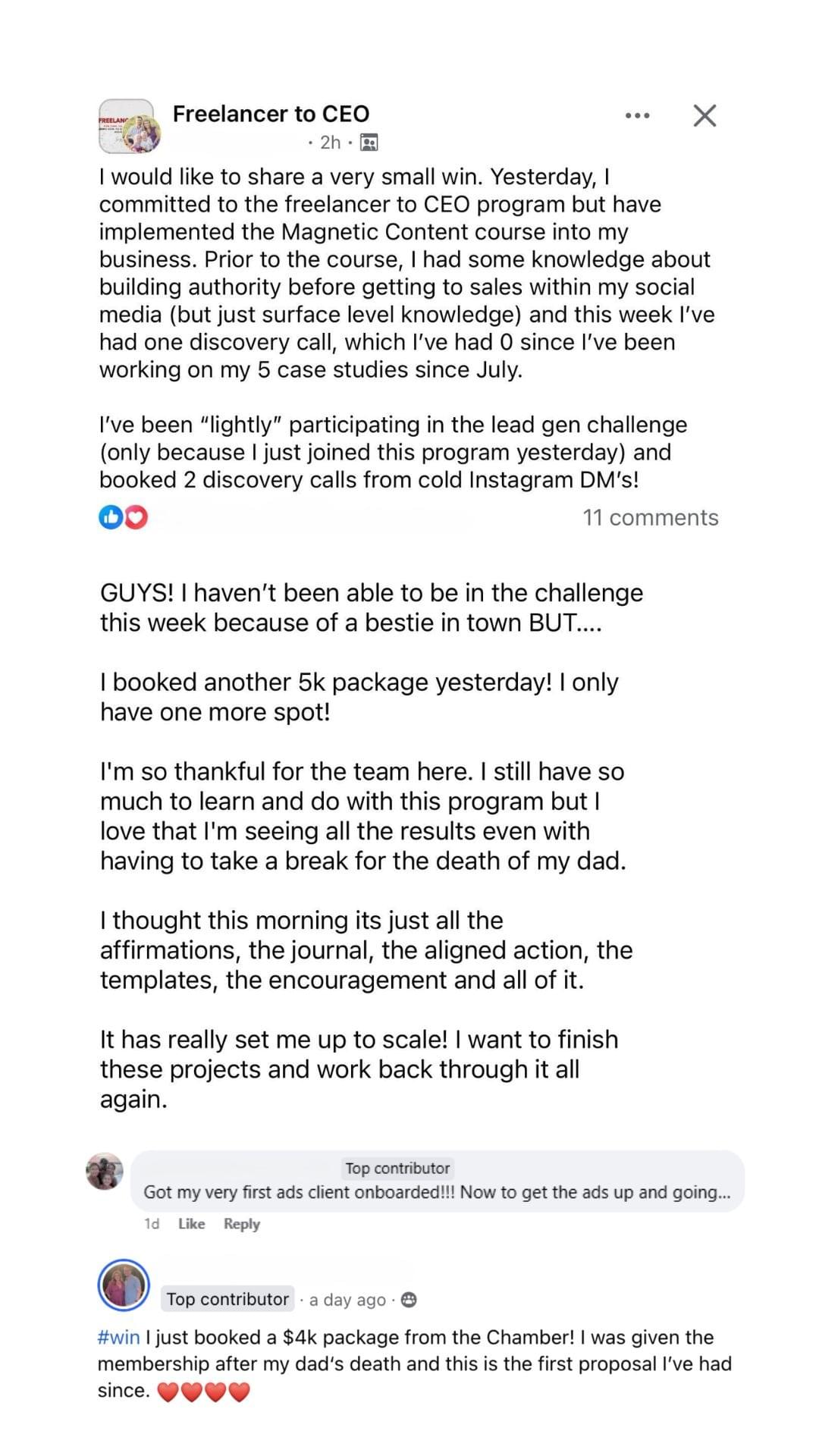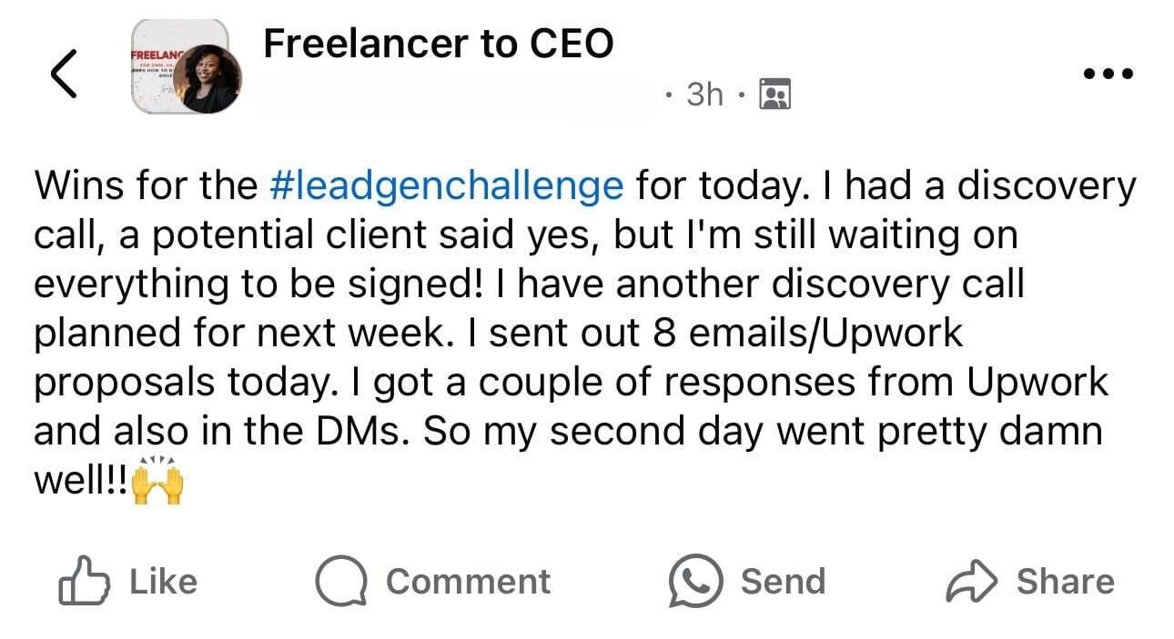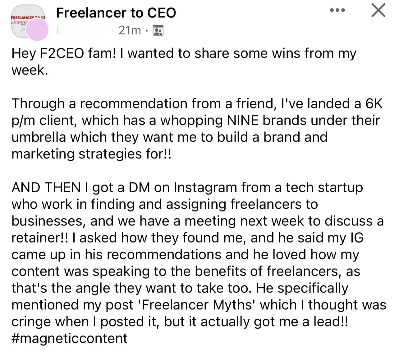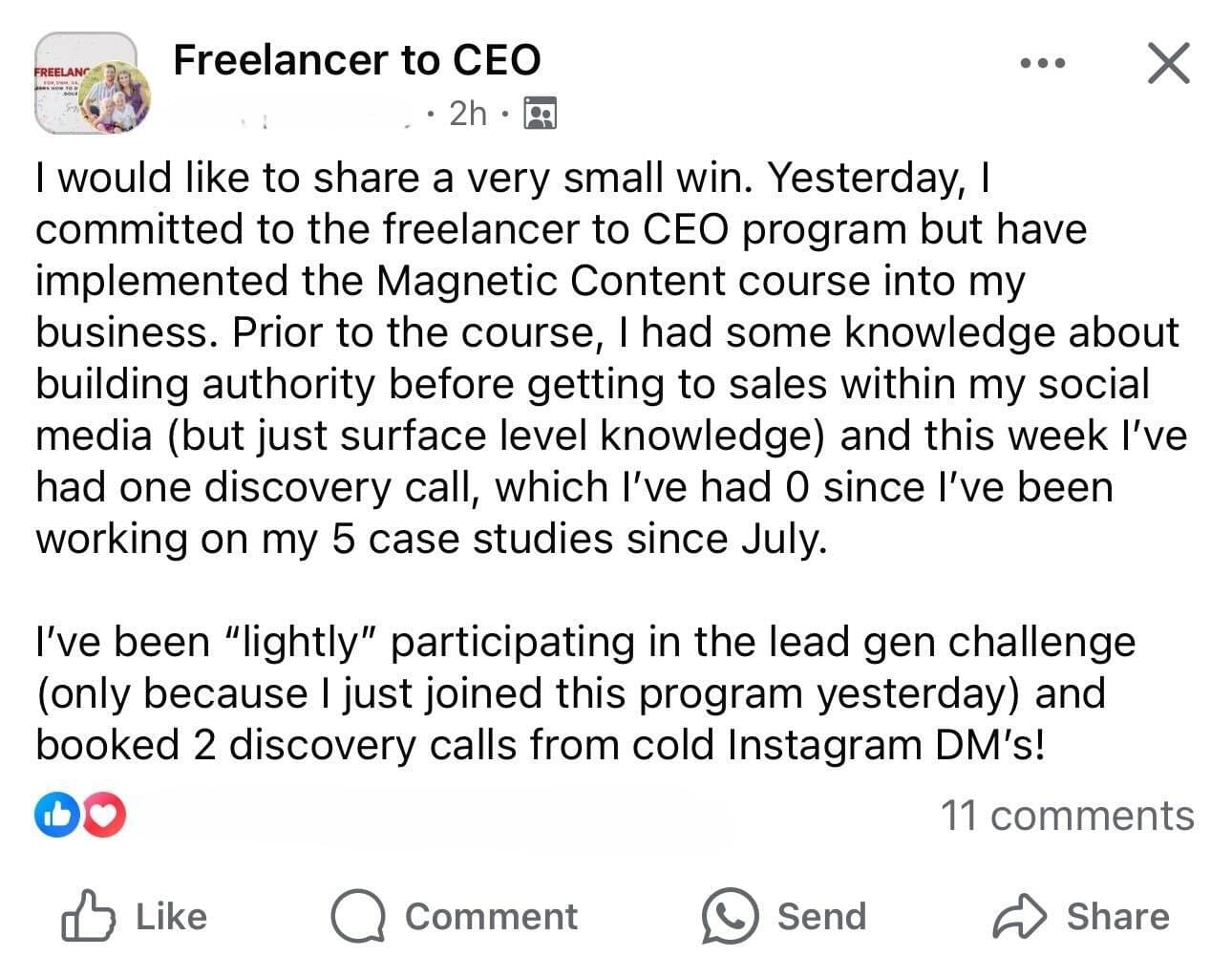 Leah has been through multiple coaching programs with no success. She started Freelancer to CEO and has built an organic IG lead gen funnel and has clients coming to HER.