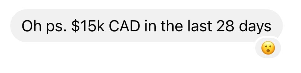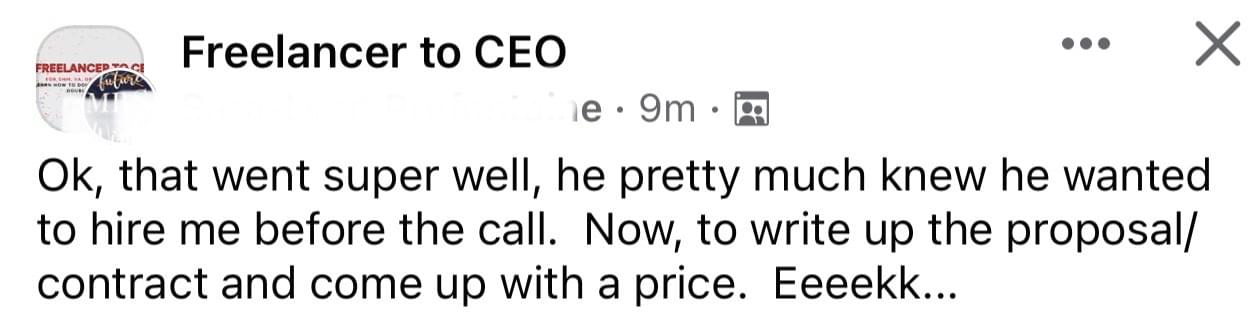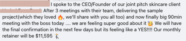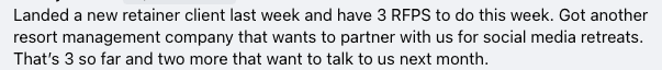 I just signed my second retainer client this month and have two more proposals out there. This brings me to $11,000/month